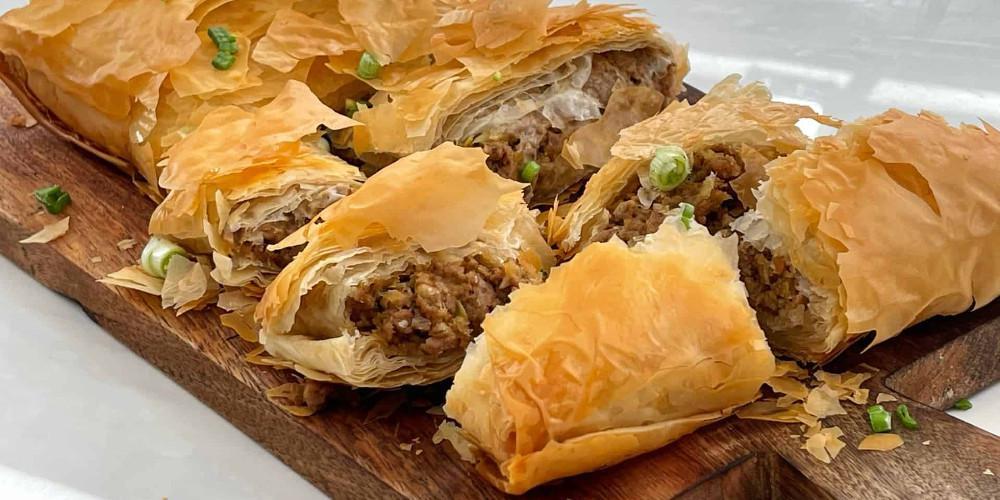 Βάζετε τον κιμά σε ένα σουρωτήρι για να φύγουν τα επιπλέον υγρά. Προσθέτετε την μπεσαμέλ, τον κροκό του αυγού και το τριμμένο κασέρι. Ανακατεύετε καλά και βάζετε στο ψυγείο για να σφίξει. Βουτυρώνετε στον πάγκο εργασίας σας ένα φύλλο.