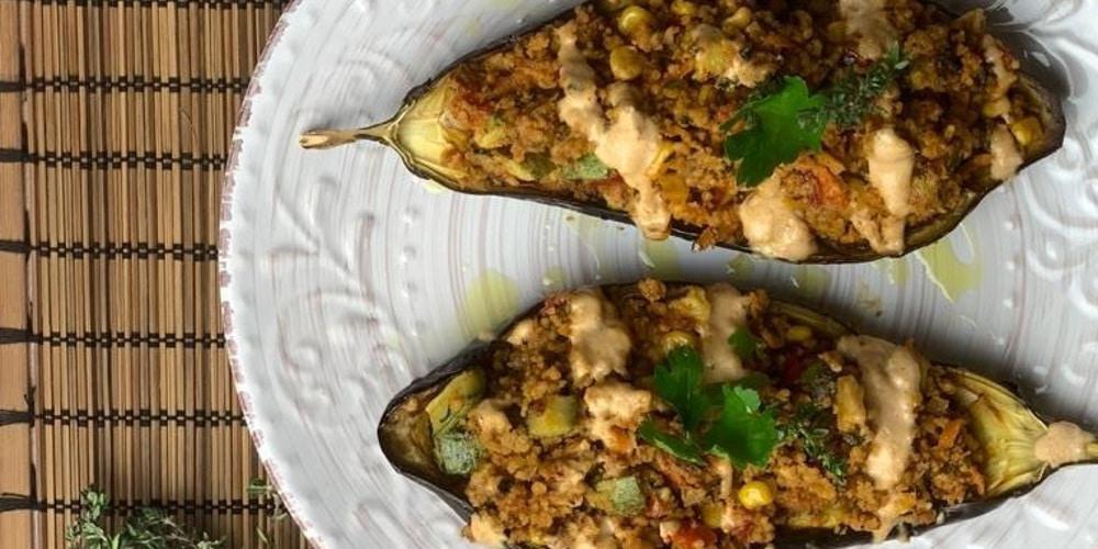 Κόβετε στη μέση κάθετα τις μελιτζάνες, χαράσσετε εσωτερικά και αφαιρείτε τη σάρκα αφήνοντας μόνο λίγη, ώστε να κρατήσουν τη φόρμα τους. Ψιλοκόβετε το εσωτερικό της μελιτζάνας και το κρατάτε σε ένα μπολ. Αλατοπιπερώνετε τις «βαρκούλες» μελιτζάνας και λαδώνετε εσωτερικά και εξωτερικά. Ψήνετε στους 180 βαθμούς για 30 λεπτά.