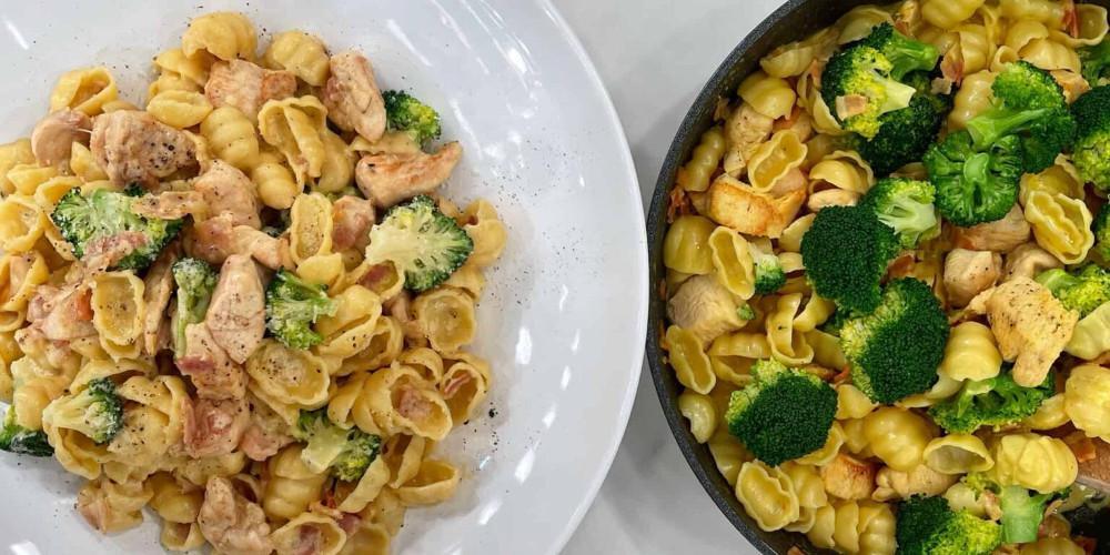 Ξεκινάτε κόβοντας το μπρόκολο σε μπουκετάκια και τα βράζετε σε αλατισμένο νερό που βράζει για 3 λεπτά, έπειτα τα βουτάτε σε μπόλ με παγωμένο νερό να κρυώσουν καλά, στραγγίζετε. Διαλύετε τον κύβο κοτόπουλο σε 150 γραμμ. νερό ζεστό. Βράζετε τα ζυμαρικά σας 2 λεπτά λιγότερο από αυτό που σας λέει η συσκευασία. Κόβετε το κοτόπουλο σε μπουκιές(κύβους).
