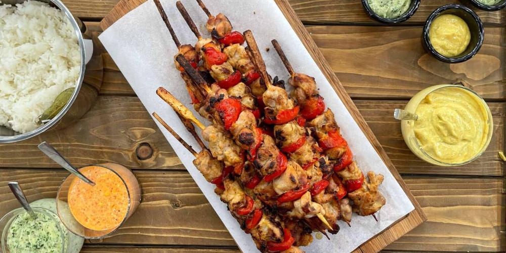 Σερβίρετε τα ινδικά σουβλάκια του κοτόπουλου πάνω σε αχνιστό μπασμάτι ρύζι, με την μαγιονέζα κάρυ και πασπαλισμένα με φρέσκο ψιλοκομμένο κρεμμύδι.