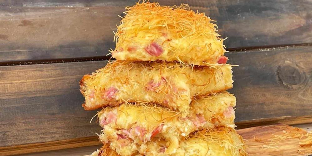 Φτιάχνετε την μπεσαμέλ. Σε ένα μπολ βάζετε όλα τα τριμμένα τυριά, το ζαμπόν, το μπέικον, τη μπεσαμέλ, τα αυγά και το μοσχοκάρυδο και ανακατεύετε. Στρώνετε το μισό κανταΐφι στον πάτο του πυρέξ και αδειάζετε από πάνω τη γέμιση. Έπειτα σκεπάζετε με το υπόλοιπο κανταΐφι, προσοχή δεν το πιέζετε, θέλετε να είναι αφράτο.