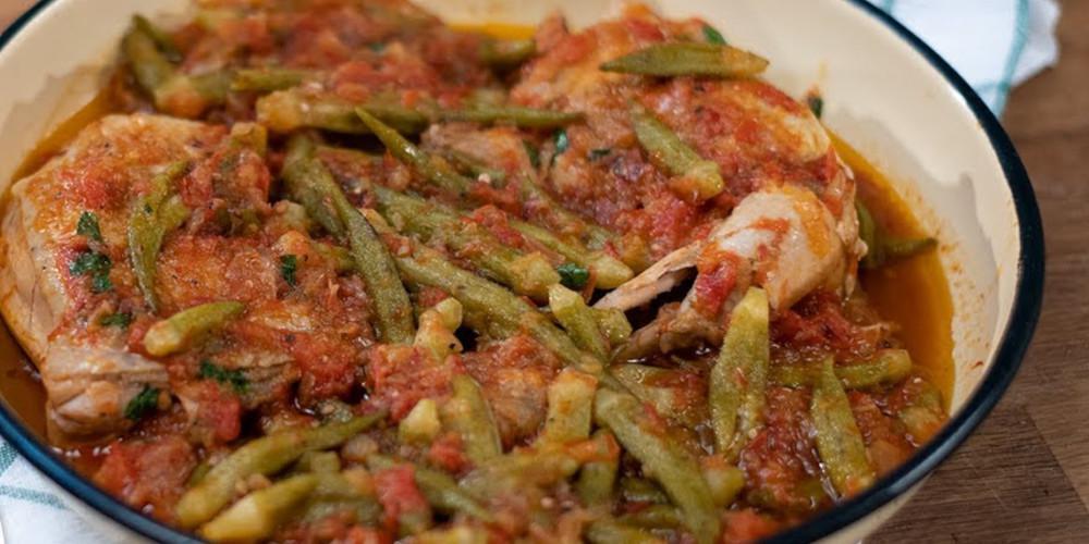 Προσθέτετε στην κατσαρόλα με το κοτόπουλο τις ντομάτες και το αλατοπίπερο. Ρίχνετε στο φαγητό το νερό και σιγοβράζετε για 40 περίπου λεπτά. Ετοιμάζετε τις μπάμιες: Σε τηγάνι σε μέτρια φωτιά ζεσταίνετε ελαιόλαδο. Σοτάρετε τις μπάμιες για 3-4 λεπτά, χωρίς να τις ανακατέψετε με σπάτουλα (θα βγάλουν το ζουμί τους και θα χαλάσουν τη γεύση τους).