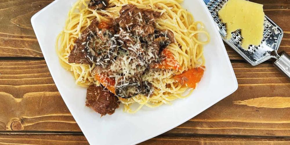 Βράζουμε τα ζυμαρικά μας 1 λεπτό λιγότερο από ότι μας αναγράφει η συσκευασία. Σουρώνουμε και, όπως είναι στο σουρωτήρι, προσθέτουμε 4-5 κουταλιές της σούπας ελαιόλαδο για να μην μας κολλήσουν και να πάρουν άρωμα. Σερβίρουμε τα σπαγγέτι, το μοσχαράκι από πάνω, πασπαλισμένα με το κεφαλοτύρι και με φρέσκια ψιλοκομμένη ρίγανη.