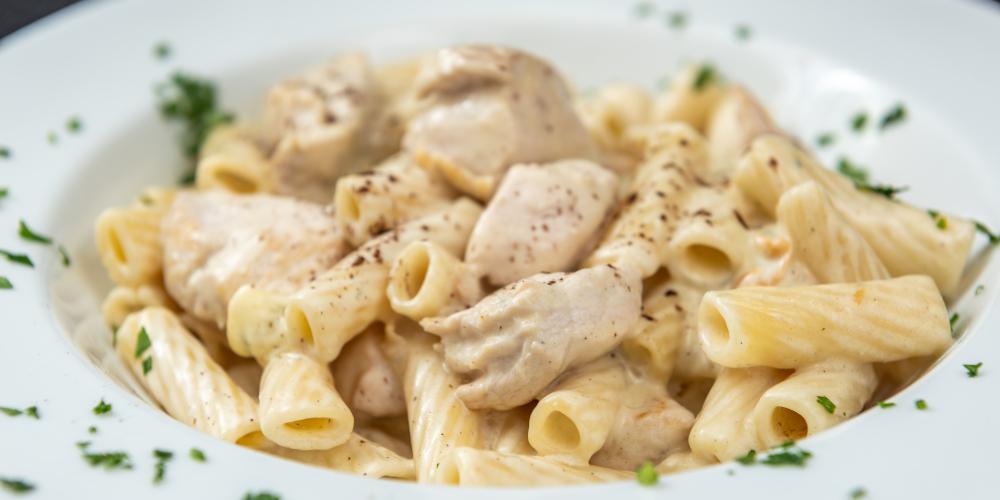 Βράζετε τα ζυμαρικά, 2 λεπτά λιγότερο από ό,τι λέει η συσκευασία. Κόβετε το κοτόπουλο σε μπουκιές (κύβους). Σε ένα αντικολλητικό τηγάνι βάζετε 1 κουταλιά ελαιόλαδο και 40 γραμμ. από το βούτυρο και όταν ζεσταθεί σοτάρετε το κοτόπουλο για 3-4 λεπτά.