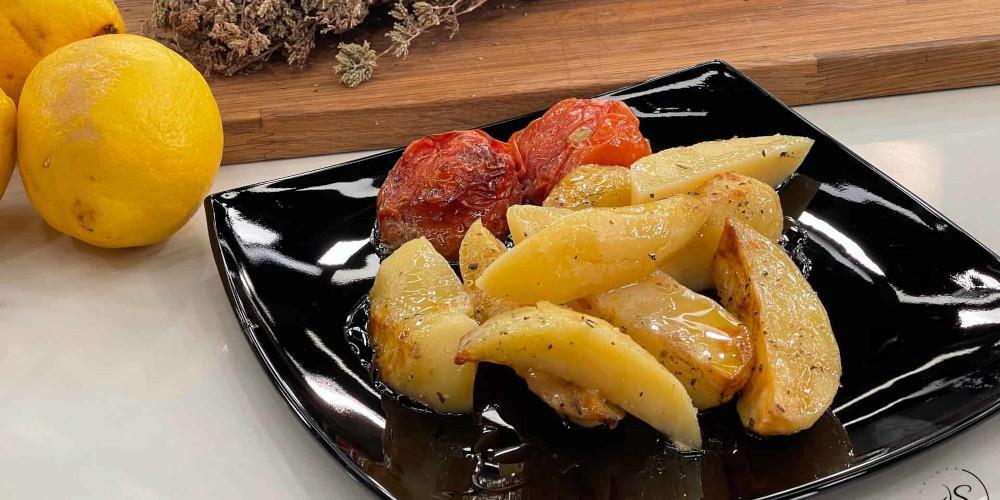 Βάζετε σε ένα μεγάλο μπολ τις πατάτες και προσθέτετε όλα τα υλικά. Ανακατεύετε καλά και τις απλώνετε στο ταψί. Προσθέτετε 1 ποτήρι νερό, μη βάλετε πολύ. Καλύπτετε το ταψί με λαδόκολλα και μετά αλουμινοχαρτο. Ψήνετε για 45 περίπου λεπτά, στους 180 βαθμούς στον αέρα σκεπασμένο. Βγάζετε το αλουμινόχαρτο και αφήνετε για 5 λεπτάκια ακόμη να πάρουν χρώμα.