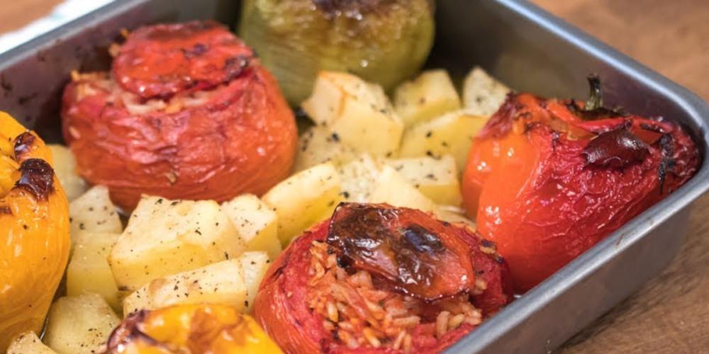 Κόβετε μια φέτα-καπάκι από κάθε πιπεριά και με το κουταλάκι αφαιρούμε τα σποράκια και το λευκό μέρος στο εσωτερικό. Αφήνετε λίγη σάρκα στο εσωτερικό της πιπεριάς για να μην ανοίξει με τη γέμιση. Πασπαλίζετε κάθε ντομάτα με λίγο αλάτι και ελάχιστη ζάχαρη. Τις γυρνάμε ανάποδα σε έναν δίσκο για μερικά λεπτά, για να βγάλουν τα υγρά τους.