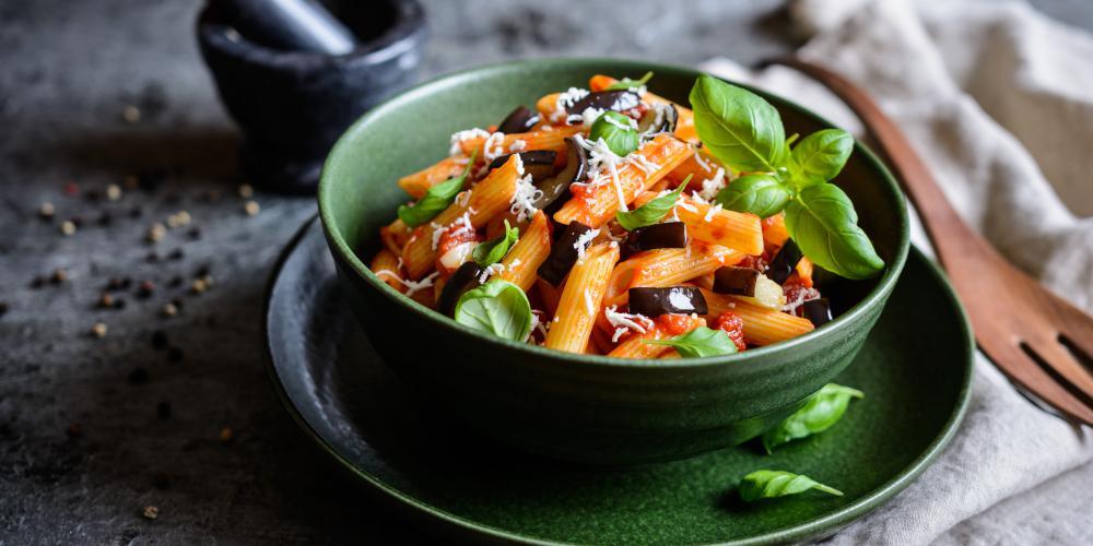 Βράζετε τα μακαρόνια για 2 λεπτά λιγότερο από ό,τι λέει η συσκευασία, τα ραντίζετε με ηλιέλαιο και τα αφήνετε στην άκρη να περιμένουν. Κόβετε τις μελιτζάνες σε κύβους των 2 εκατοστών. Τηγανίζετε τις μελιτζάνες σε ηλιέλαιο μέχρι να πάρουν ένα χρυσαφί χρώμα.