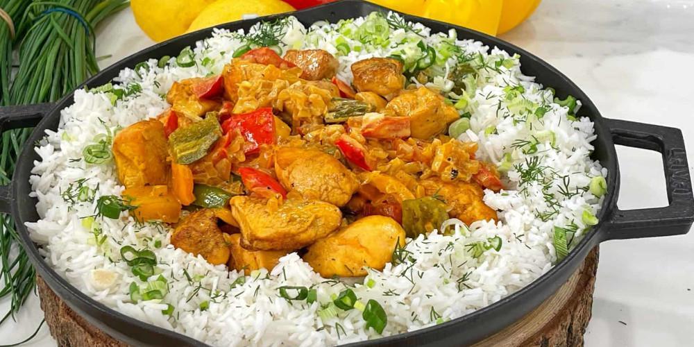 Σε ένα κατσαρολάκι βάζουμε τον κύβο κοτόπουλο με 100 ml νερό και όταν πάρει βράση προσθέτουμε το σαφράν, ανακατεύουμε και αφήνουμε στην άκρη. Σε ένα μέτριο τηγάνι βάζουμε το λαδί και 20 γραμμ. βούτυρο φρέσκο. Όταν ανεβεί η θερμοκρασία, βάζουμε το κοτόπουλο που έχουμε κόψει σε μερίδες και, σε δυνατή φωτιά, το σοτάρουμε πολύ καλά για 4 λεπτά και μέχρι να πάρει ένα χρυσαφί χρώμα.