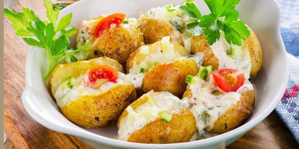 Βγάζουμε τις πατάτες από τον φούρνο. Τις κόβουμε κάθετα στη μέση χωρίς να χωρίσουμε τα δύο κομμάτια και αφαιρούμε όσο μπορούμε από το εσωτερικό τους για να το γεμίσουμε. Γεμίζουμε τις πατάτες με τα θαλασσινά. Περιχύνουμε με τη σάλτσα και πασπαλίζουμε με κρεμμυδάκια φρέσκα, ντοματίνια και με φουντίτσες μαϊντανού.
