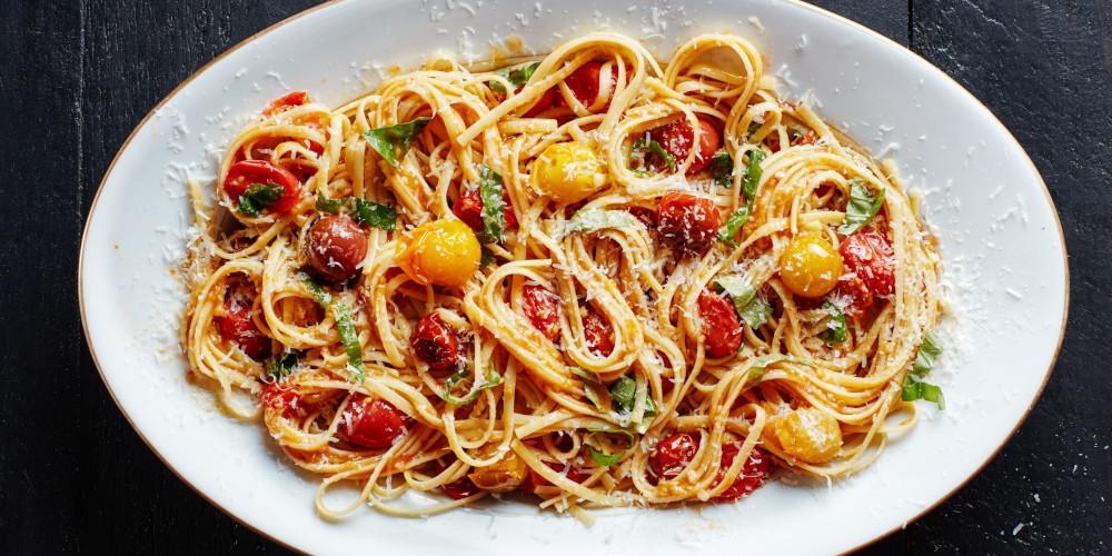 Σοτάρουμε σε ελαιόλαδο 2 σκελίδες σκόρδου και 1 ψιλοκομμένο κρεμμύδι με ολόκληρα ντοματάκια τσέρι, προσθέτοντας αλάτι και πιπέρι για περίπου 15 λεπτά, σε μέτρια φωτιά. Στη συνέχεια ρίχνουμε τα υλικά στα βρασμένα μακαρόνια και ανακατεύουμε. Αν θέλουμε τρίβουμε παρμεζάνα.