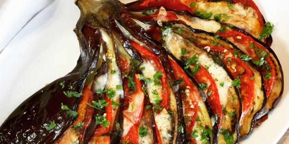 Πλένω καλά τις μελιτζάνες ολόκληρες και τις σκουπίζω. Με ένα κοφτερό μαχαίρι κόβω την κάθε μελιτζάνα σε λεπτές φέτες πάχους 1 εκ., αφήνοντάς τες ενωμένες στην πλευρά που βρίσκεται το κοτσάνι τους. Αλατίζω καλά τις μελιτζάνες και τις αφήνω σε ένα σουρωτήρι για 1 ώρα για να βγάλουν την πικρίλα τους.