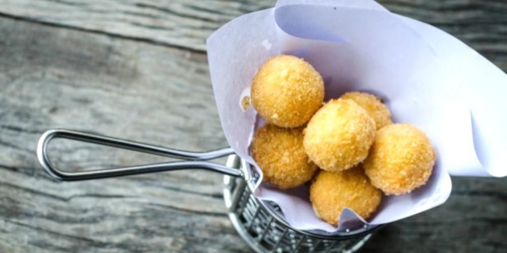 Σε ένα βαθύ πιάτο ανακατεύω τα υλικά του παναρίσματος. Βάζω αρκετό ελαιόλαδο σε ένα βαθύ τηγάνι να ζεσταίνεται σε μέτρια φωτιά. Βγάζω το μείγμα από το ψυγείο και παίρνω μικρές δόσεις με ένα κουτάλι της σούπας. Πιέζω το μείγμα στις παλάμες μου και τοποθετώ στο κέντρο ένα κύβο τυριού. Κλείνω καλά και «κυλάω» το κεφτεδάκι στο μείγμα παναρίσματος. Συνεχίζω μέχρι να τελειώσουν όλα τα υλικά και τηγανίζω τα κεφτεδάκια για 3-5 λεπτά μέχρι να ροδίσουν ολόγυρα.