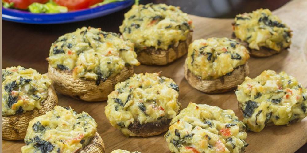 Σε ένα μέτριο μπολ, βάζουμε τη ρικότα, την κρέμα τυριού, το μοσχοκάρυδο, το αλάτι και τη μοτσαρέλα. Ανακατεύουμε καλά και προσθέτουμε το μείγμα της κατσαρόλας, αναμιγνύοντας καλά όλα τα υλικά. Απλώνουμε ίδια ποσότητα μείγματος μέσα στα καπέλα των μανιταριών. Το μείγμα θα προεξέχει.