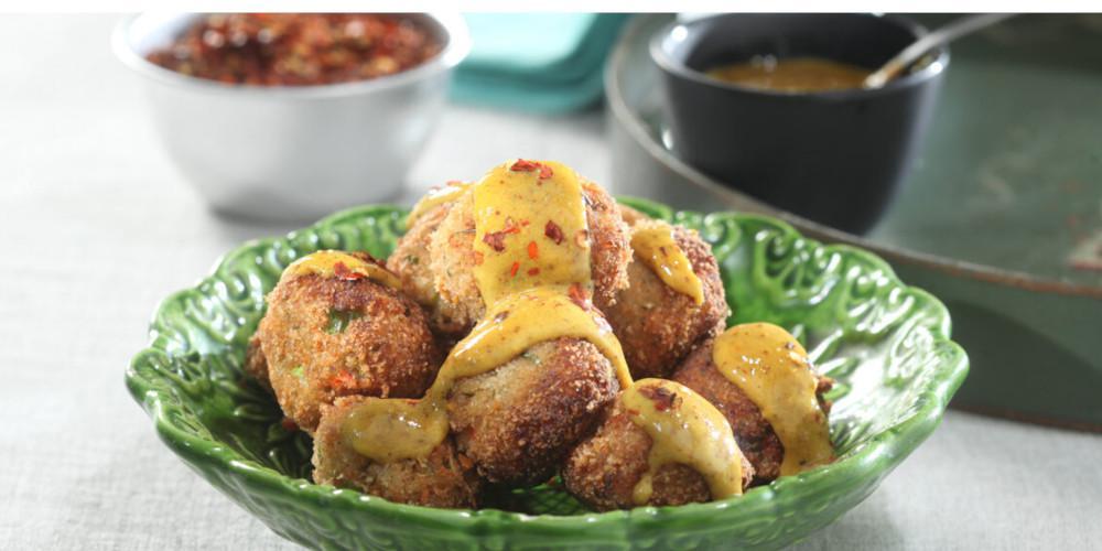 Σερβίρω τα κεφτεδάκια ραντίζοντάς τα με την πικάντικη βινεγκρέτ. Για την βινεγκρέτ: Σε ένα μικρό μπολ ανακατεύω καλά τα υλικά.