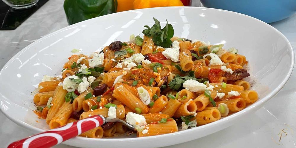 Αφαιρούμε τα κουκούτσια από τις ελιές, κόβουμε σε φιλετάκια και προσθέτουμε στο τηγάνι. Βάζουμε την μισή ποσότητα θρυμματισμένης φέτας, ανακατεύουμε, αλατοπιπερώνουμε. Σερβίρουμε σε μια πιατέλα, πασπαλίζουμε με ψιλοκομμένο φρέσκο κρεμμυδάκι, ρίγανη και την υπόλοιπη θρυμματισμένη φέτα από πάνω.