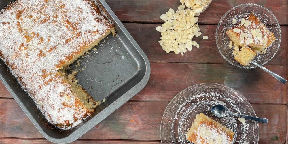 Βγάζουμε από τον φούρνο και κόβουμε σε κομμάτια μέχρι κάτω. Ρίχνουμε το σιρόπι απευθείας προσεκτικά. Πασπαλίζουμε με καρύδα, μέχρι να καλύψουμε όλη την επιφάνεια. Σερβίρουμε με παγωτό σοκολάτα!