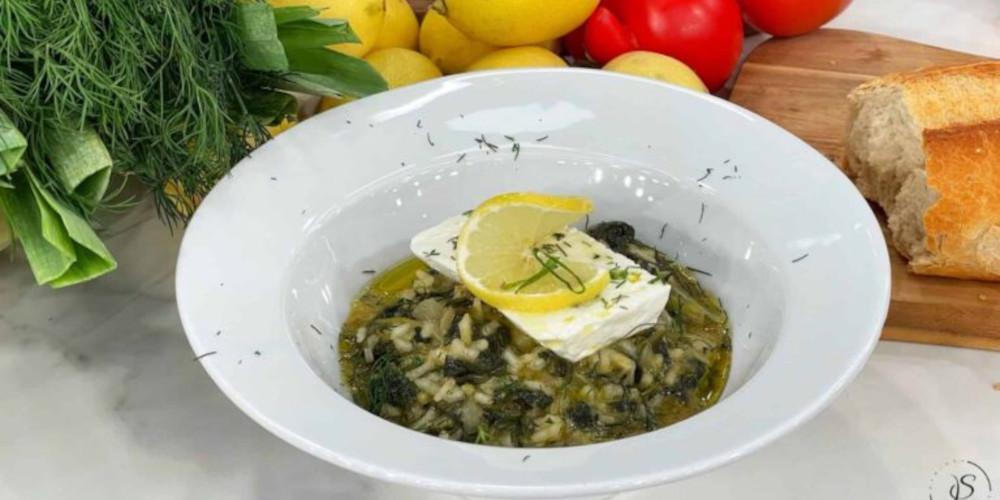 Κλείνουμε τη φωτιά και προσθέτουμε το πράσινο μέρος από το φρέσκο κρεμμύδι, τον άνηθο, λίγο ελαιόλαδο, λεμόνι και ξυπνά από λεμόνι. Δοκιμάζουμε και αλατοπιπερώνουμε. Σκεπάζουμε πάλι με το καπάκι και αφήστε για 5 λεπτά να τραβήξει τα υγρά του. Τέλος, σερβίρουμε στο πιάτο με ψιλοκομμένο άνηθο, ξύσμα λεμόνι, ελαιόλαδο και τυρί φέτα.
