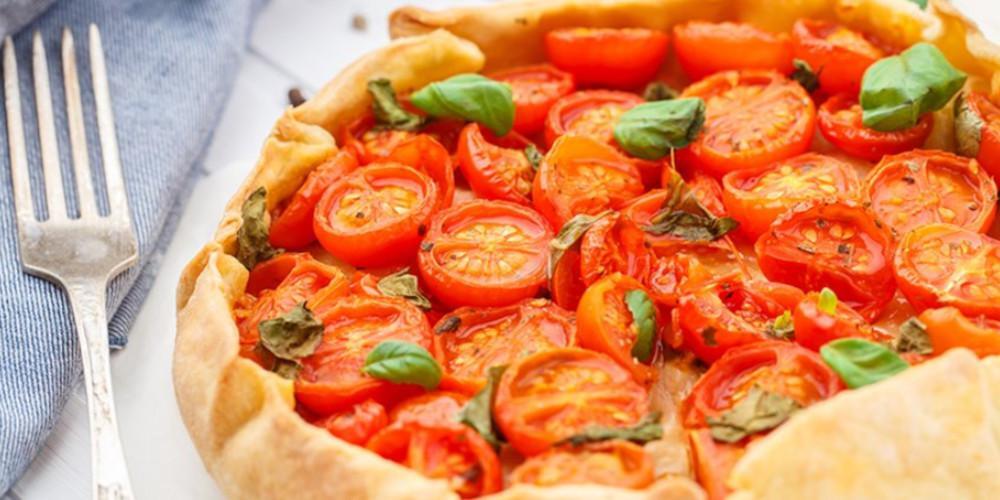 Απλώνουμε ομοιόμορφα πάνω στη γέμιση το κρεμμύδι εναλλάξ με τις πιπεριές και τις ελιές. Καλύπτουμε την επιφάνεια της ζύμης κουρού με τα ντοματίνια και αλατίζουμε πάλι. Διπλώνουμε τις άκρες της ζύμης σε ρολό προς τα μέσα, γύρω απο τη γέμιση. Ψήνουμε την πίτα για 40 λεπτά στον προθερμασμένο φούρνο, μέχρι να ροδοκοκκινίσει η επιφάνειά της. Γαρνίρουμε με φύλλα βασιλικού και κάπαρη και σερβίρουμε.