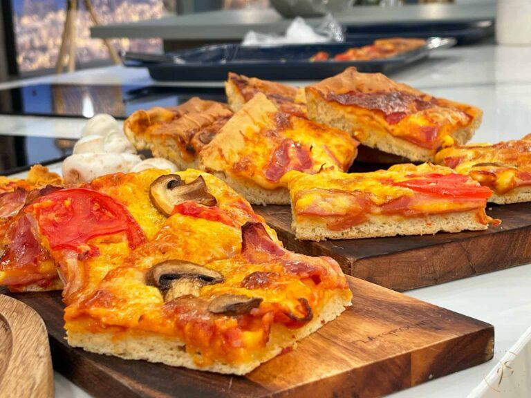 Για το στήσιμο τις πίτσας: Έχουμε απλώσει τα ζυμάρια στα ταψιά, προσθέτουμε την σάλτσα, τις φέτες ζαμπόν, τα τυριά που έχουμε ανακατέψει και τέλος το μπέικον, τις φέτες τομάτας και τα μανιτάρια. Ψήνουμε στους 180 για 40 λεπτά στον αέρα.