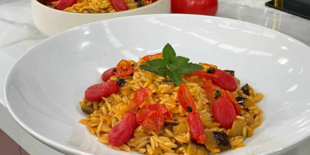 Στη συνέχεια προσθέτουμε το κριθαράκι, σoτάρουμε και σβήνουμε με το κρασί για να έχουμε ένα ωραίο κριθαρότο. Ενσωματώνουμε και την σάλτσα από την ψητή ντομάτα ψήνουμε ρίχνοντας κατά περιόδου από λίγο ζωμό λαχανικών, μέχρι να χυλώσει το κριθαράκι. Προσθέτουμε την μελιτζάνα και τις δύο κουταλιές ψιλοκομμένο δυόσμο. Μπορούμε να προσθέσουμε και μια κουταλιά της σούπας βούτυρο και παρμεζάνα για να γίνει πιο κρεμώδες. Ανακατεύουμε καλά και το απλώνουμε σε μια μεγάλη στρογγυλή πιατέλα. Το γαρνίρουμε με τα φύλλα του δυόσμου και τα ντοματίνια.