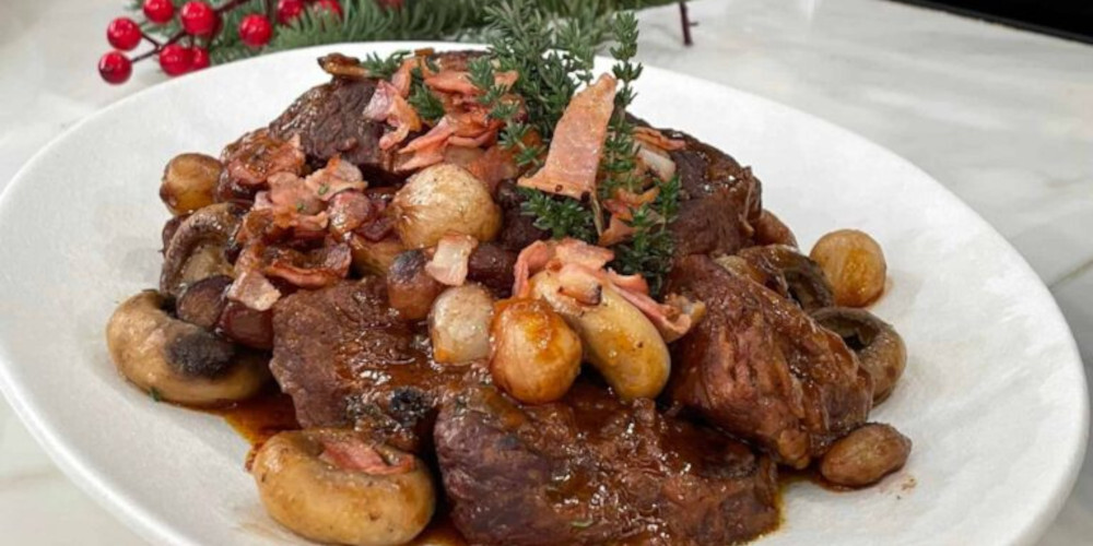 Προσθέστε ½ λίτρο βοδινού ζωμού, αφήστε το να σιγοβράσει και μετά τοποθετήστε το στο φούρνο όπως είναι με την κατσαρόλα και το καπάκι στους 140-150 °C. Βεβαιωθείτε ότι έχει υγρά και δεν στέγνωσε μετά από περίπου δύο ώρες. Αν χρειαστεί, προσθέστε λίγο ζωμό βοδινού κρέατος.