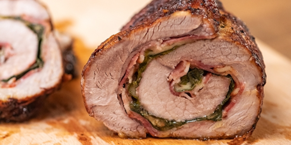 Προθερμαίνουμε τον φούρνο στους 200 στις αντιστάσεις. Για το ρολό, θα χρειαστούμε χοιρινό μπούτι. Ζητάμε από τον κρεοπώλη μας να μας «ανοίξει» το χοιρινό έτσι ώστε να είναι κατάλληλο για να το τυλίξουμε σε ρολό. Το ακουμπάμε σε λαδόκολλα και το γεμίζουμε με φέτες μπέικον. Καλύπτουμε με φρέσκο σπανάκι.