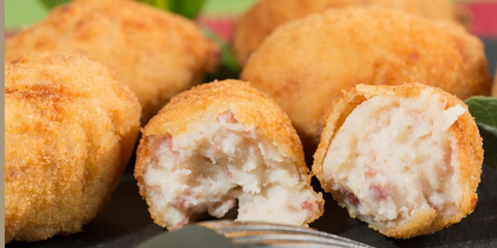 Σε ένα μεγάλο μπολ αναμειγνύουμε τον πουρέ πατάτας, τον κρόκο αυγού, το κρεμμυδάκι, το μπέικον και 1/4 φλ. αλεύρι. Ζυμώνουμε το μείγμα σε 20 περίπου μπαλάκια. Προσθέτουμε πιέζοντας ένα κομμάτι μοτσαρέλα στο κέντρο κάθε μπάλας και πλάθουμε το μείγμα για να καλύψουμε το τυρί.