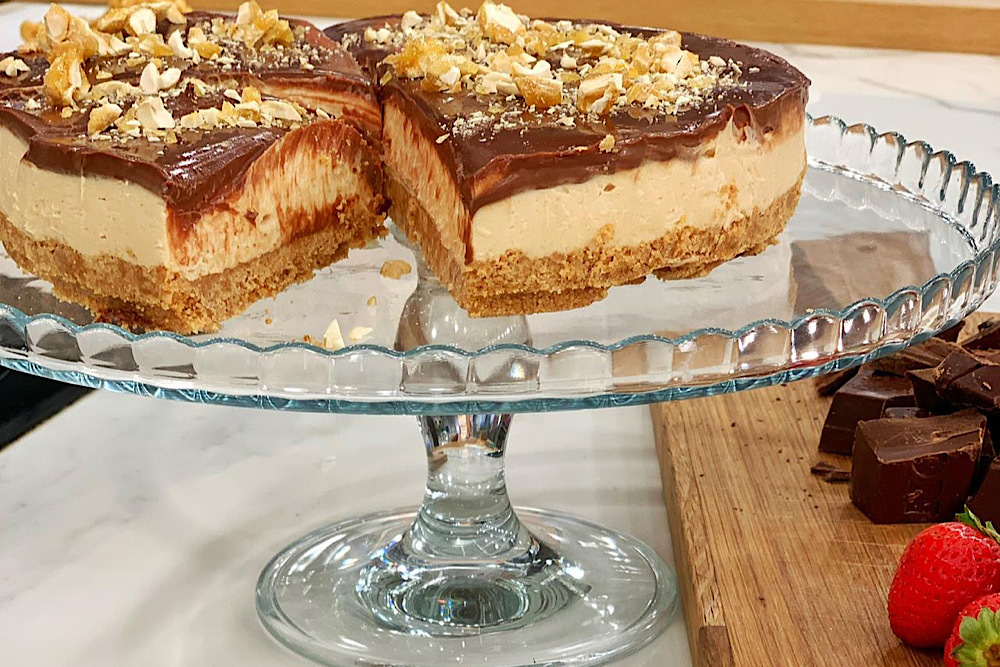 Την ρίχνουμε πάνω απ’ τα μπισκότα στην φόρμα του κέικ, απλώνουμε ομοιόμορφα και ξαναβάζουμε στο ψυγείο για τουλάχιστον 5 ώρες ή το βάζουμε στην κατάψυξη για 2 ώρες.