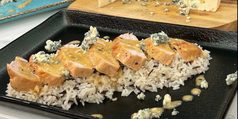 Όταν εξατμιστεί λίγο το κρασί, προσθέτουμε τον ζωμό κοτόπουλο (ανακατεύουμε το ζεστό νερό με ένα κύβο κοτόπουλο) και αφήνουμε να βράσει λίγο το κοτόπουλο. Μετά από 5 λεπτά προσθέτουμε την κρέμα γάλακτος, αφήνουμε να πάρει μια βράση, αφαιρούμε το κοτόπουλο και τέλος ρίχνουμε τα τυριά για να δέσει η σάλτσα μας. Κόβουμε το φιλέτο σε ταλιατα (φέτες), το βάζουμε πάνω σε ρύζι ανάμεικτο και προσθέτουμε τη σάλτσα, μπούκοβο και ψιλοκομμένο σχοινόπρασο.