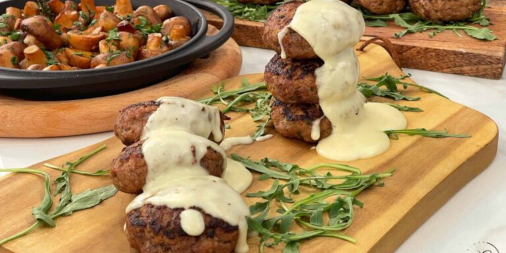 Πλάθουμε τα μπιφτέκια και τα αλείφουμε με ελαιόλαδο. Τα ψήνουμε στο σχαροτήγανο και τα τοποθετούμε σε μια πιατέλα. Όταν τα κάνουμε όλα, ζεσταίνουμε την σάλτσα παρμεζάνας και τα περιχύνουμε. Τελειώνουμε πασπαλίζοντας τα με λίγο σχοινόπρασο.