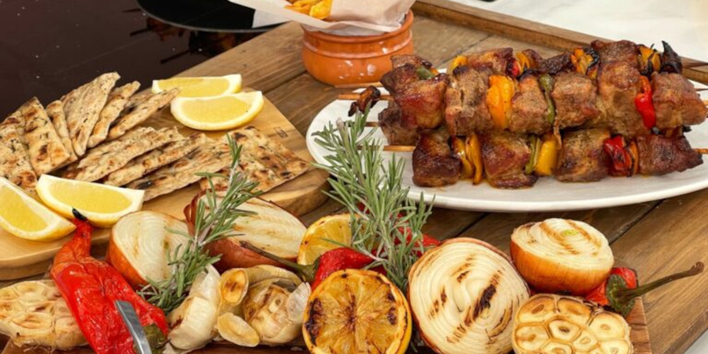 Το βάζουμε σε μια λεκάνη, σκεπάζουμε με μεμβράνη και το αφήνουμε να μαριναριστεί για 5 ώρες στο ψυγείο. Κόβουμε τις πιπεριές περιμετρικά σε κομμάτια καθώς και όλα τα αλλά. Σε σούβλα περνάμε το χοιρινό κρέας εναλλάξ με πιπεριά κόκκινη, κρεμμύδι και μετά με πράσινη πιπεριά και ντομάτα.