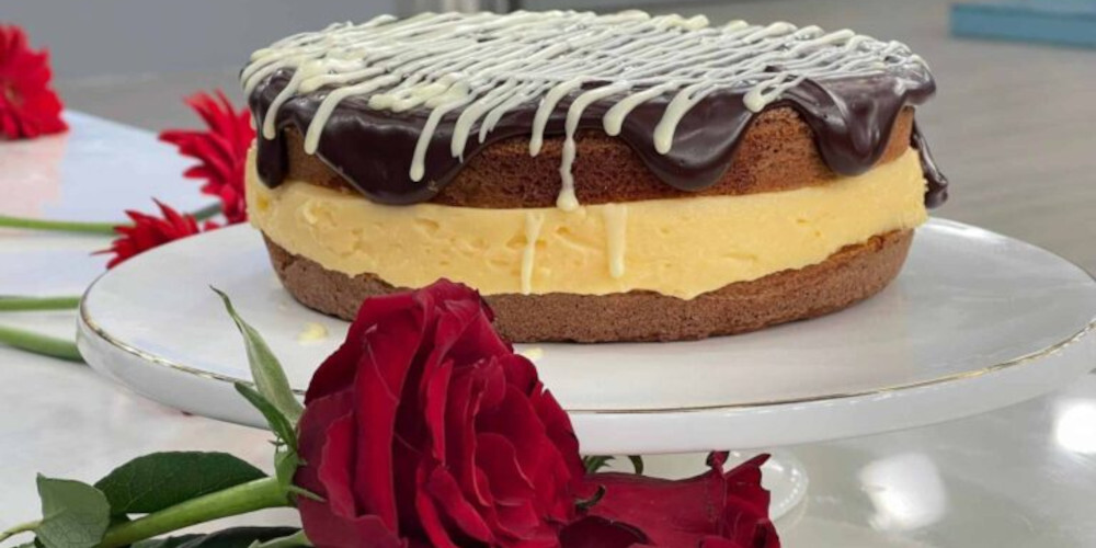 Κόψτε το κέικ στη μέση οριζόντια. Τοποθετήστε το κάτω μισό, με την κομμένη πλευρά προς τα πάνω σε ένα πιάτο σερβιρίσματος. Απλώστε την παγωμένη, παχύρρευστη κρέμα ζαχαροπλαστικής πάνω από το κέικ, κάνοντας ένα περίγραμμα 3 πόντων. Γεμίστε με το υπόλοιπο το κενό και πιέστε απαλά προς τα κάτω για να απλωθεί η γέμιση στην άκρη. Βάλτε το στο ψυγείο και αφήστε το για τουλάχιστον 2 ώρες ή όλη τη νύχτα. Καλύψτε με πλαστικό και αφήσετε την κρυώσει για περισσότερες από δύο ώρες.