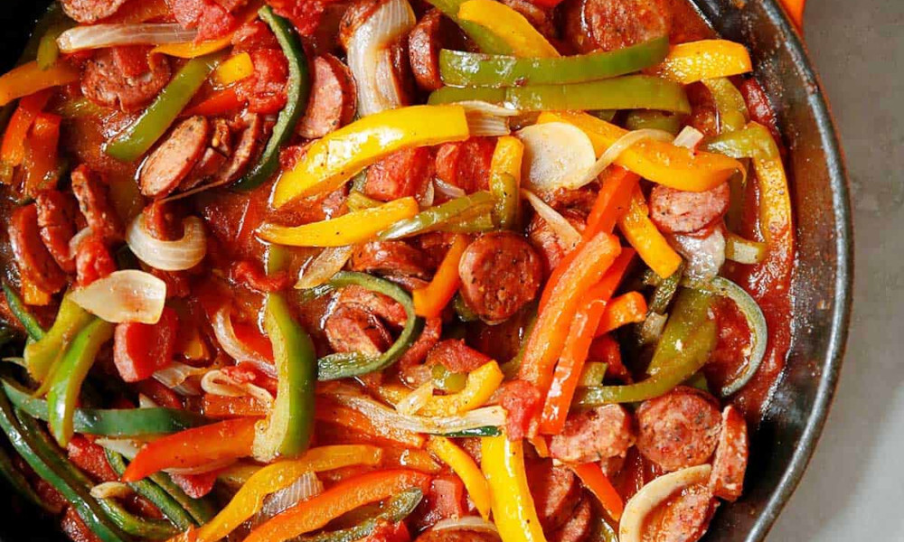 Διαλέγουμε τις πιπεριές που προτιμάμε, πράσινες, κόκκινες ή πορτοκαλί, τις ξεσποριάζουμε και τις κόβουμε σε ομοιόμορφες λεπτές φέτες. Σε αντικολλητικό τηγάνι, σε μέτρια προς δυνατή φωτιά, προσθέτουμε ελάχιστο ελαιόλαδο και μόλις ζεσταθεί ρίχνουμε το λουκάνικο κομμένο σε χοντρές φέτες.