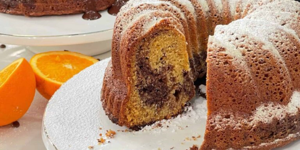 Στο υπόλοιπο μείγμα ρίχνουμε το κακάο και ανακατεύουμε με ένα κουτάλι. Βάζουμε σε διάφορα σημεία με το κουτάλι το μείγμα σοκολάτας και στριφογυρίζουμε λίγο με το κουτάλι ώστε να ανακατευτούν αλλά όχι πολύ. Ψήνουμε για 40 λεπτά στους 175 και στη συνέχεια για 15 λεπτά στους 180. Αφαιρούμε από τον φούρνο το βγάζουμε στον πάγκο μας και αφήνουμε για 15 λεπτά να κρυώσει. Έπειτα αναποδογυρίζουμε σε ένα πιάτο και, όταν κρυώσει τελείως, πασπαλίζουμε με ζάχαρη άχνη.