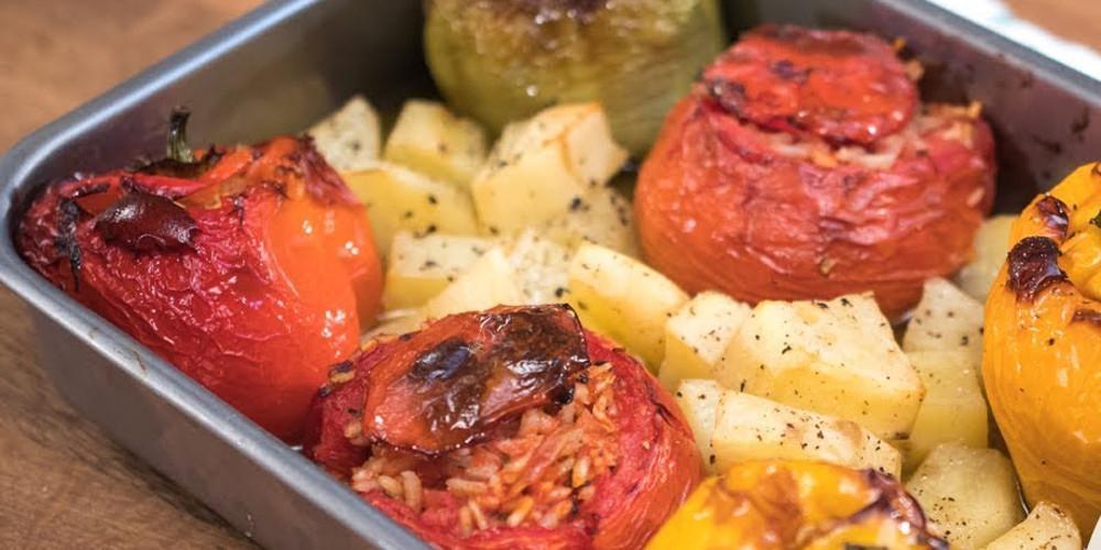 Αφαιρούμε τα καπάκια από τις ντομάτες και τις πιπεριές.