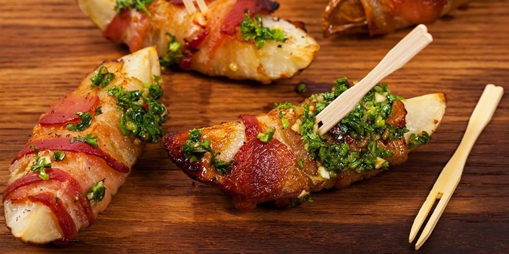 Τυλίγετε γύρω από κάθε πατάτα μία λωρίδα μπέικον. Καρφώνετε την άκρη με μία οδοντογλυφίδα για να μην ανοίξει και χαλάσει το σχήμα και τοποθετείτε στη λαμαρίνα του φούρνου. Ετοιμάζετε κατά τον ίδιο τρόπο και τις υπόλοιπες πατάτες. Βάζετε στο φούρνο και ψήνετε για 30 περίπου λεπτά.