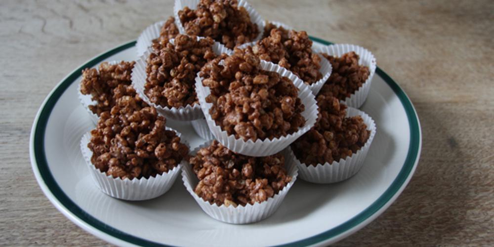 Σε μπεν μαρί λιώνετε την κουβερτούρα. Σε αντικολλητικό τηγάνι, χωρίς λάδι ή βούτυρο, καβουρδίζετε τα φουντούκια. Προσθέτετε τα φουντούκια, τα φιστίκια και τις νιφάδες ρυζιού στην λιωμένη κουβερτούρα και ανακατεύετε καλά.