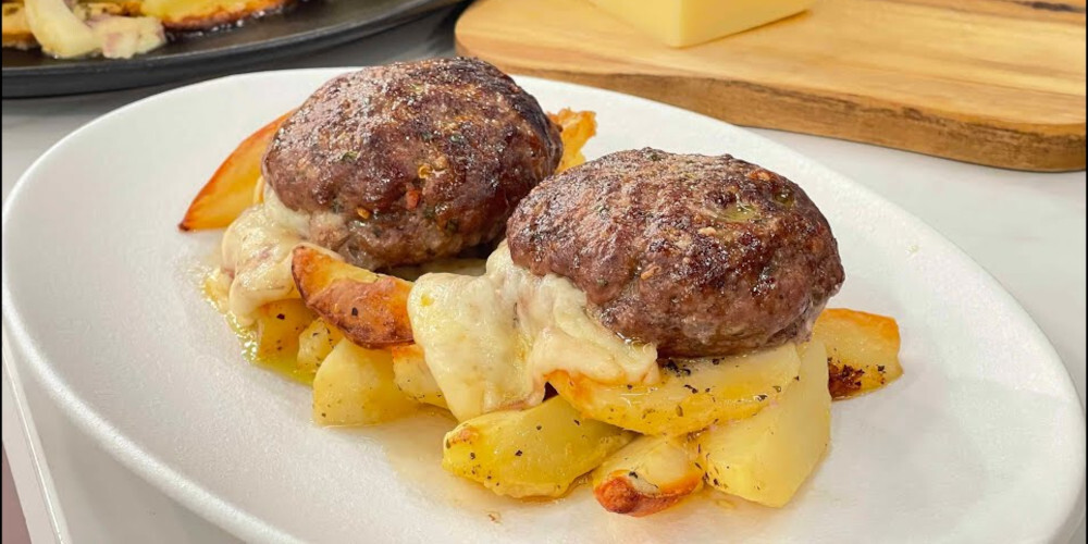 Θα χρειαστούμε 125 γραμμ. κιμά να το πλάσουμε μπαλάκι και να το ανοίξουμε στον πάγκο μας με τα δάχτυλα. Ενδιάμεσα θα βάλουμε ένα κομμάτι κασέρι και από πάνω να σκεπάσουμε με ίδιο πλασμένο 125 γραμμ. μπιφτέκια. Κλείνουμε καλά γύρω γύρω και αφού έχουμε μισή ώρα τις πατάτες μας στον φούρνο. Ακουμπάμε τα μπιφτέκια πάνω στις πατάτες και ψήνουμε για ακόμη 25-30 λεπτά.