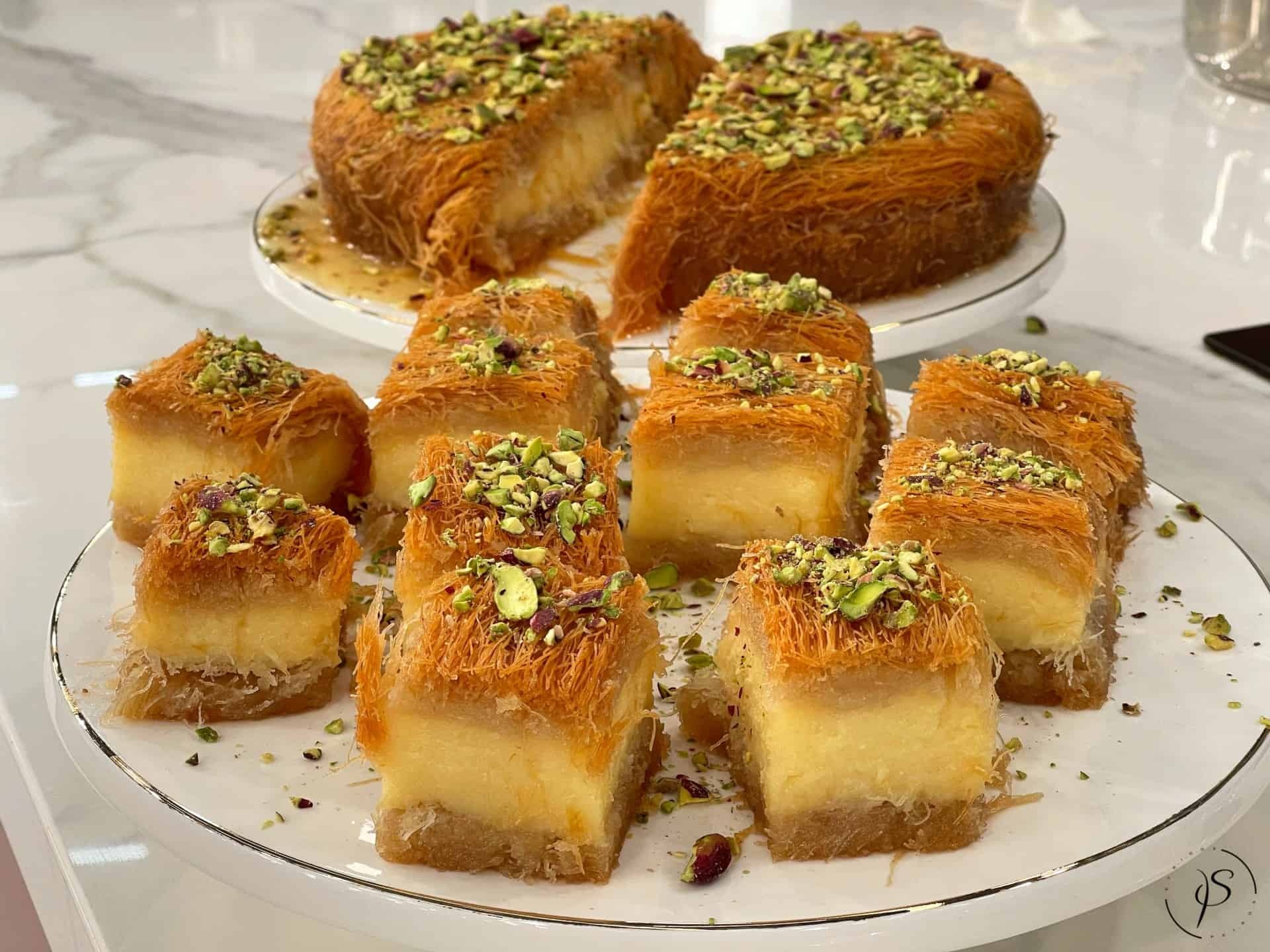 Σε ένα ταψάκι μιας χρήσης ή σε ένα ταψί 30 εκ βουτυρώνουμε με το λιωμένη βούτυρο. Ξάνουμε το κανταΐφι και το χωρίζουμε στη μέση. Στρώνουμε τη μισή ποσότητα κανταΐφι στο ταψί, βουτυρώνουμε καλά με ένα πινέλο πιτσιλώντας όχι να ακουμπάει το πινέλο. Από πάνω προσθέτουμε την κρέμα και το υπόλοιπο κανταΐφι με βούτυρο. Ψήνουμε στους 160-170 βαθμούς για 45 λεπτά στον αέρα, βγάζουμε το ταψί, τουμπάρουμε το γλυκό σε ένα πιάτο προσεκτικά και ξανά ψήνουμε μέχρι να πάρει ωραίο χρώμα και από πάνω. Όταν ψηθεί, μετά από 30-40 λεπτά περίπου βγάζουμε από τον φούρνο, αφήνουμε λίγα λεπτά και σιροπιάζουμε σε 2 δόσεις σταδιακά.