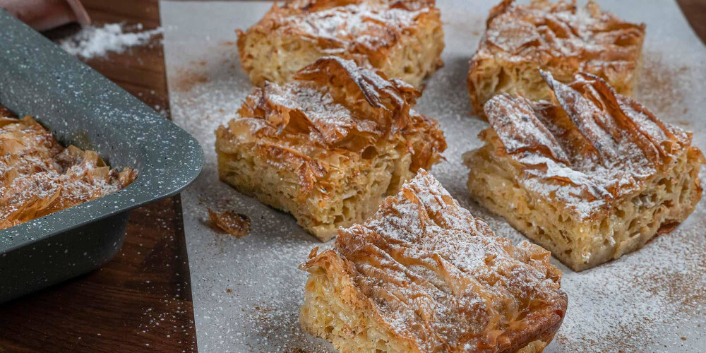 Ψήνουμε στον αέρα σε προθερμασμένο φούρνο για περίπου 25΄ μέχρι να φουσκώσει η μπουγάτσα, να σταθεροποιηθεί η κρέμα και να ροδίσει ελαφρά. Μόλις τη βγάλουμε από το φούρνο, αφήνουμε να σταθεί για 10 λεπτά. Πασπαλίζουµε µε ζάχαρη άχνη και κανέλα.