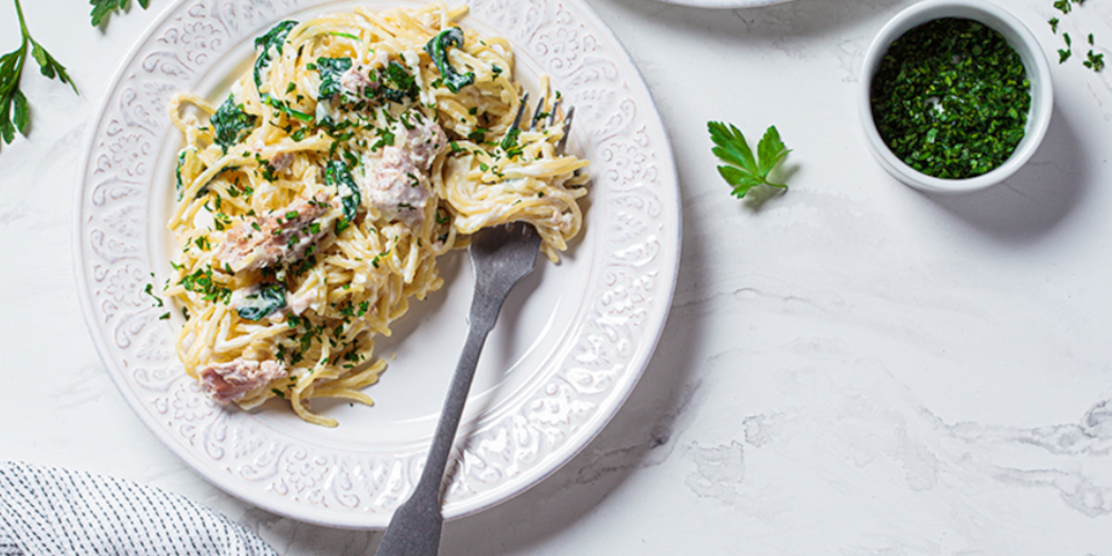 Σε μια μεγάλη κατσαρόλα με αλατισμένο νερό που βράζει, ρίχνουμε τα σπαγέτι και τα μαγειρεύουμε αλ ντέντε, 2 λεπτά λιγότερο από το χρόνο που αναγράφεται στις οδηγίες του πακέτου. Κρατάμε 1/2 φλ. νερό από τα ζυμαρικά που έβρασαν και το αφήνουμε στην άκρη. Εντωμεταξύ, σε ένα μεγάλο τηγάνι ρίχνουμε το ελαιόλαδο και σοτάρουμε το φρέσκο κρεμμυδάκι σε μέτρια φωτιά, μέχρι να μαλακώσει.