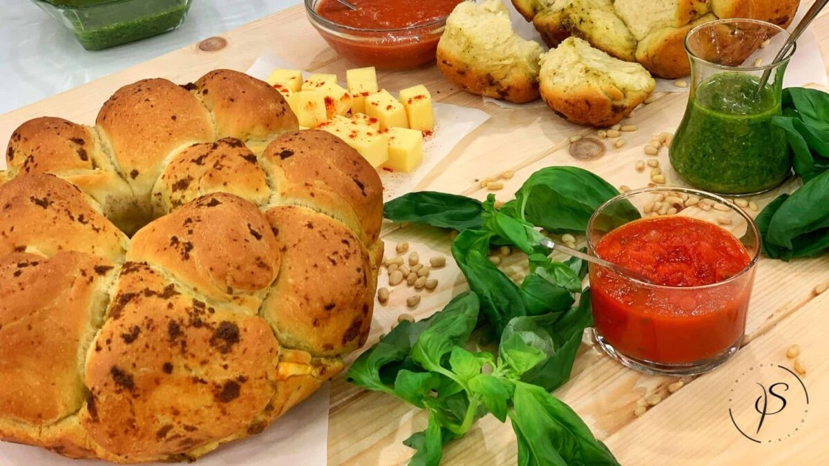 Για την συναρμολόγηση: Αφού έχει φουσκώσει η ζύμη την κόβετε σε μπάλες των 50 γραμμαρίων, την ανοίγετε με την βοήθεια των χεριών και αγκαλιάζετε μέσα της την μοτσαρέλα. Έπειτα την περνάτε μέσα από το πέστο και την τοποθετείτε σε μια βουτυρωμένη φόρμα του κέικ, συνεχίζετε την διαδικασία για όλη την ζύμη, ψήνετε στους 180 για 45 λεπτά περίπου. Σερβίρετε με την σάλτσα ντομάτας.