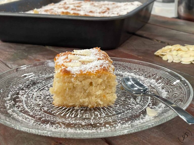 Βάζουμε το μείγμα μας και το ψήνουμε σε προθερμασμένο φούρνο στους 180c για 45′ και μέχρι να ροδοκοκκινίσει. Όταν ψηθεί, το κόβουμε σε κομμάτια και το περιχύνουμε με το κρύο σιρόπι. Αφήνουμε το γλυκό μας να απορροφήσει όλο το σιρόπι.