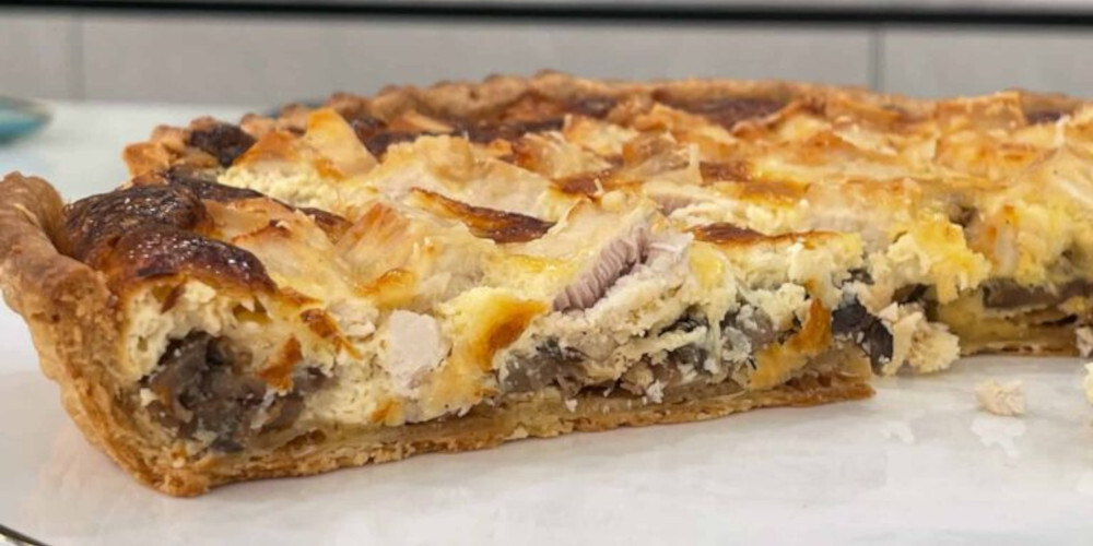 Σε μια κατσαρόλα βάλτε το βούτυρο με το ελαιόλαδο και σοτάρετε τα μανιτάρια που τα έχετε κόψει σε φέτες για 5-7 λεπτά μέχρι να ροδίσουν. Προσθέστε το ψιλοκομμένο σκόρδο. Σβήστε τη φωτιά και προσθέστε το βρασμένο κοτόπουλο σε κύβους. Απλώστε στην ψημένη τάρτα το κοτόπουλο με τα μανιτάρια, στη συνέχεια προσθέστε την γραβιέρα.