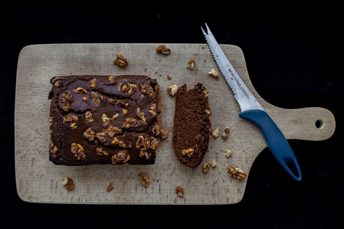 Τέλος, προσθέτετε τα θρυμματισμένα καρύδια και ανακατεύετε απαλά. Λαδώνετε με ένα πινέλο μία φόρμα και αλευρώνετε πολύ καλά. Ρίχνετε μέσα το μείγμα και στρώνετε ομοιόμορφα την επιφάνεια. Ψήνετε σε προθερμασμένο φούρνο στους 180 βαθμούς στον αέρα για περίπου 45 – 50 λεπτά. Έπειτα βγάζετε από το φούρνο, αφήνετε να κρυώσει και ξεφορμάρετε. Κόβετε τη σοκολάτα σε μικρά κομμάτια. Βάζετε την κρέμα γάλακτος σε ένα κατσαρολάκι να ζεσταθεί.