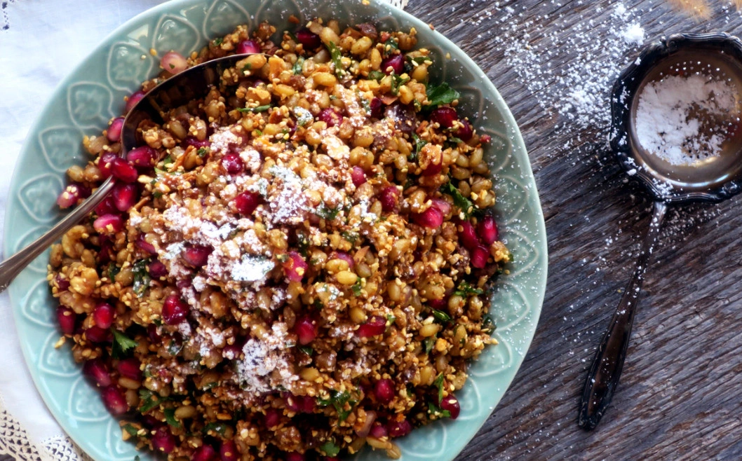 Μεταφέρουμε το σιτάρι σε μπολ και προσθέτουμε την άχνη και ανακατεύουμε.