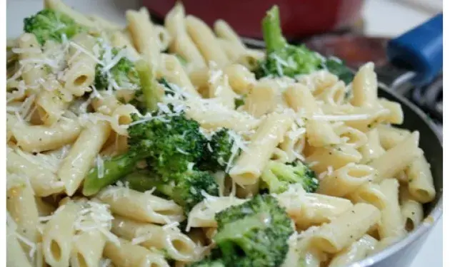 Στραγγίζουμε την πάστα και την ρίχνουμε πάλι στην κατσαρόλα μαζί με 1κ.σ. περίπου από το νερό που έβραζε και ρίχνουμε επάνω το «πέστο» μπρόκολου, μαζί με το χυμό από το υπόλοιπο λεμόνι.