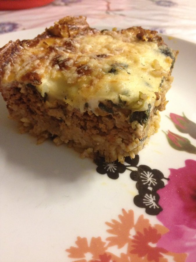 Λαδώνετε ένα μέτριο ταψί και το πασπαλίζετε με τρεις τέσσερις κουταλιές της σούπας γαλέτα. Στρώνετε τις μισές μελιτζάνες στο ταψί σε μια στρώση και πασπαλίζετε με δύο κουταλιές της σούπας γαλέτα. Απλώνετε όλη τη γέμιση ομοιόμορφα από πάνω και πασπαλίζετε με λίγη γαλέτα ακόμα. Στρώνετε τις υπόλοιπες μελιτζάνες από πάνω.