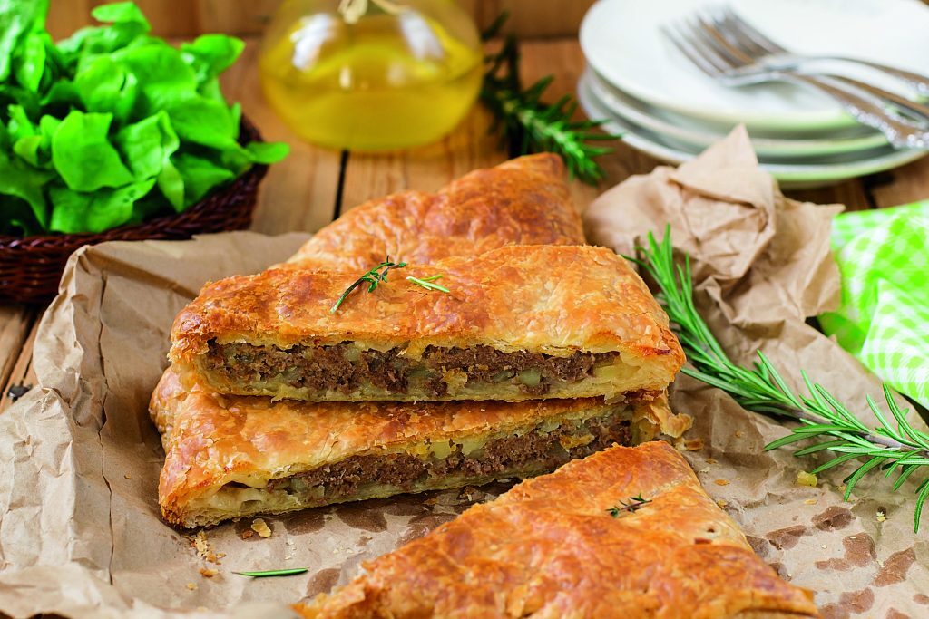 Σε ένα λαδωμένο ταψί 25 x 35 εκ. στρώνουμε 4 φύλλα περνώντας σε σχήμα σταυρού (βάζοντας το μισό έξω, το μισό μέσα). Βάζουμε 2 φύλλα στο κέντρο και προσθέτουμε τη γέμιση, προσθέτουμε, αν θέλουμε, λίγη γραβιέρα τριμμένη, κλείνουμε με τα φύλλα που εξέχουν, αλείφοντας συνεχώς με ελαιόλαδο. Βάζουμε άλλα 4 φύλλα από πάνω περνώντας και πάλι με ελαιόλαδο. Σε ένα μπολάκι ανακατεύουμε το ελαιόλαδο, το γιαούρτι και τον κρόκο. Στο τελευταίο φύλλο περνάμε με αυτό το μίγμα, πασπαλίζουμε με σουσάμι και μαυροκούκι. Κόβουμε την πίτα σε κομμάτια, ραντίζουμε με λίγο νερό και ψήνουμε στους 175 βαθμούς για 50 λεπτά στον αέρα και μετά δυναμώνουμε λίγο για 10 λεπτά στους 200 βαθμούς.