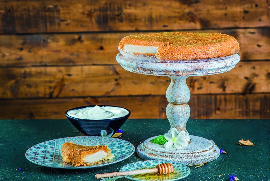 Επειτα σκεπάζουμε με το υπόλοιπο κανταΐφι. Προσοχή: Δεν το πιέζουμε, θέλουμε να είναι αφράτο. Χαράσσουμε σε τετράγωνα κομμάτια. Σε ένα μπολ χτυπάμε τα 5 αβγά με το γάλα, την κρέμα γάλακτος και φρεσκοτριμμένο πιπέρι, περιχύνουμε το κανταΐφι.